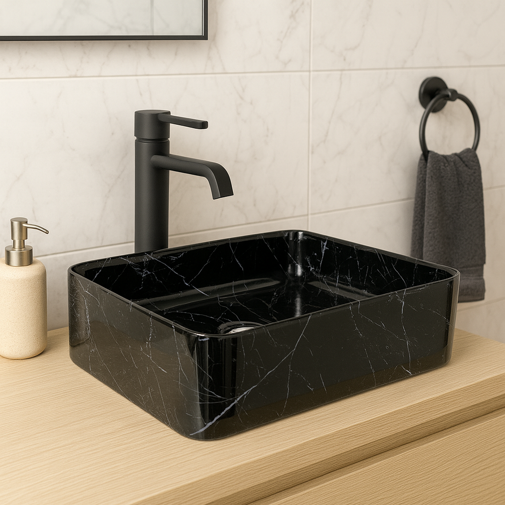 Apportez une touche de raffinement à votre salle de bain avec la Vasque Noir/Gris 60×34 Rinova K390YSB. Conçue en céramique haut de gamme, cette vasque à poser séduit par sa finition noire effet marbre et son format rectangulaire, parfait pour un style moderne et élégant.